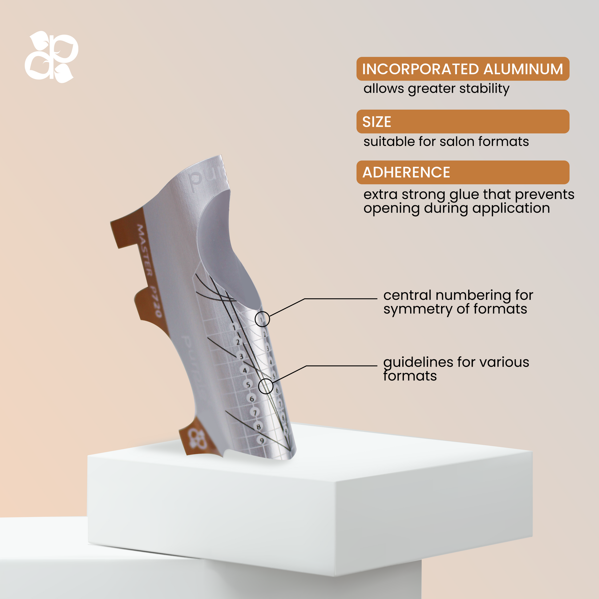 De 157g Master Molds van 100 stuks vallen op door hun aluminium samenstelling, wat zorgt voor meer stabiliteit en weerstand. De extra sterke lijm voorkomt losraken. Bevat centrale en laterale nummering en richtlijnen voor de verschillende formaten. Het is gemakkelijk aan te brengen en aan te passen aan de natuurlijke nagel.
