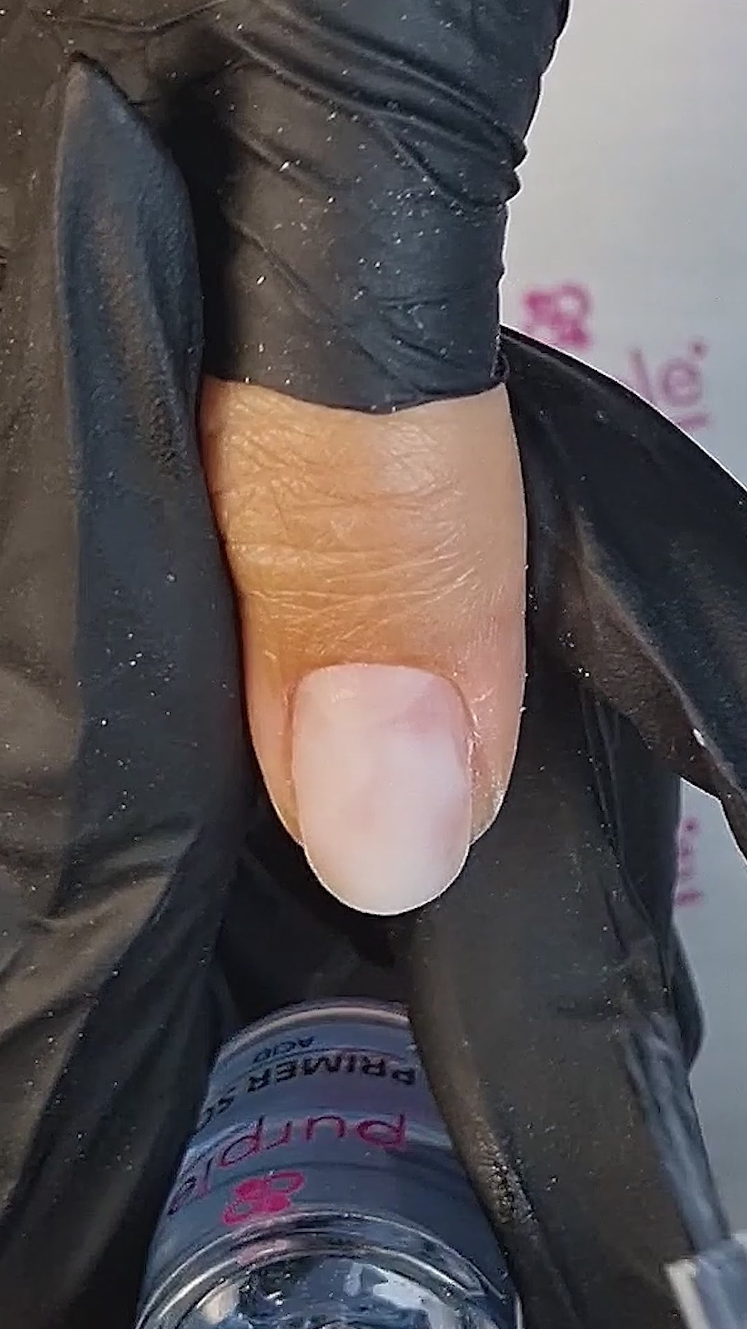 Prepare the natural nails: clean the nails, file/shape as required, push back cuticles, and dehydrate the nail plate.