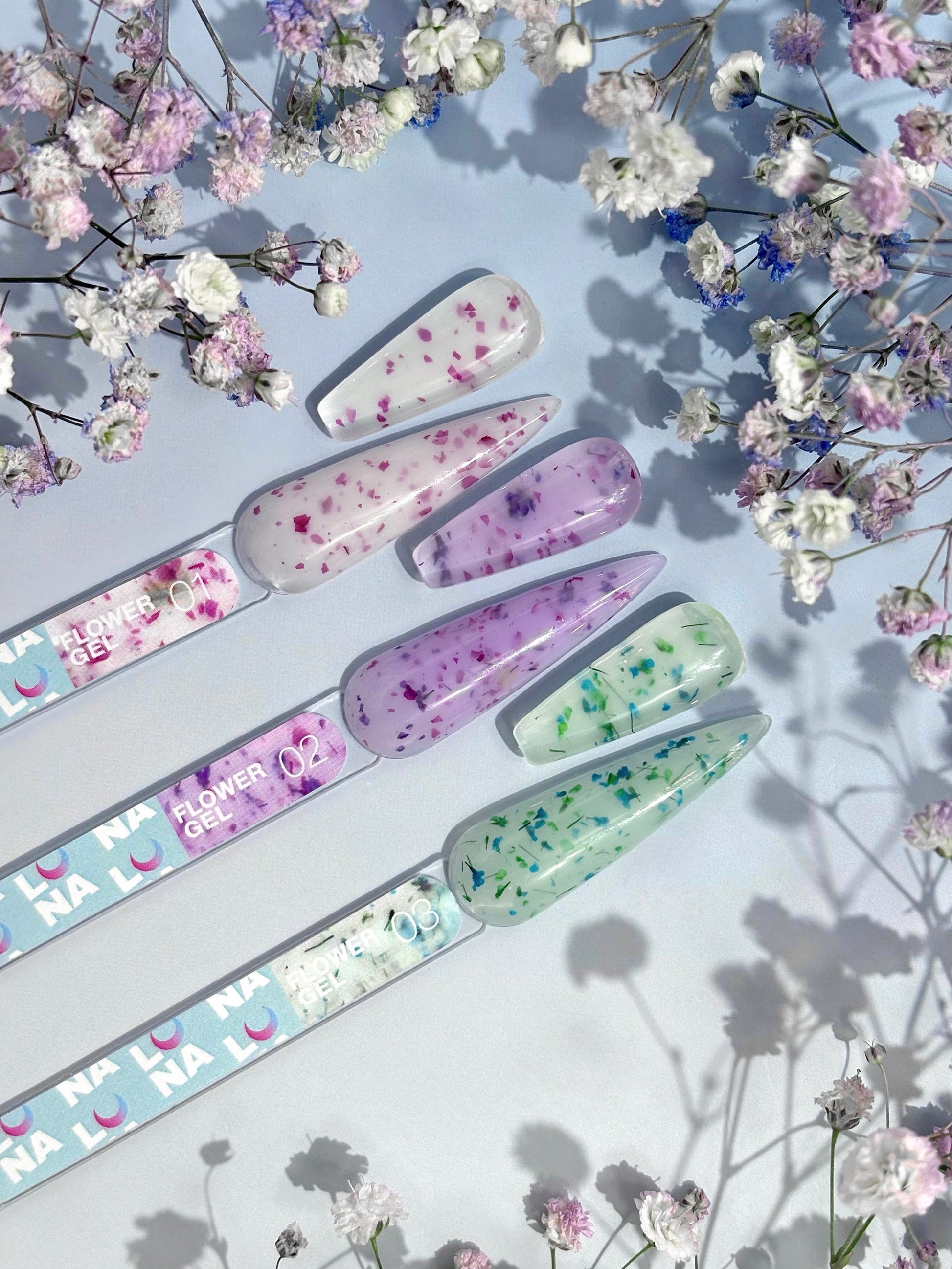 LUNAmoon Flower Gel is a unique builder gel that combines professional technology with exceptional artistic details: real dried flowers suspended in a semi-transparent milky base.