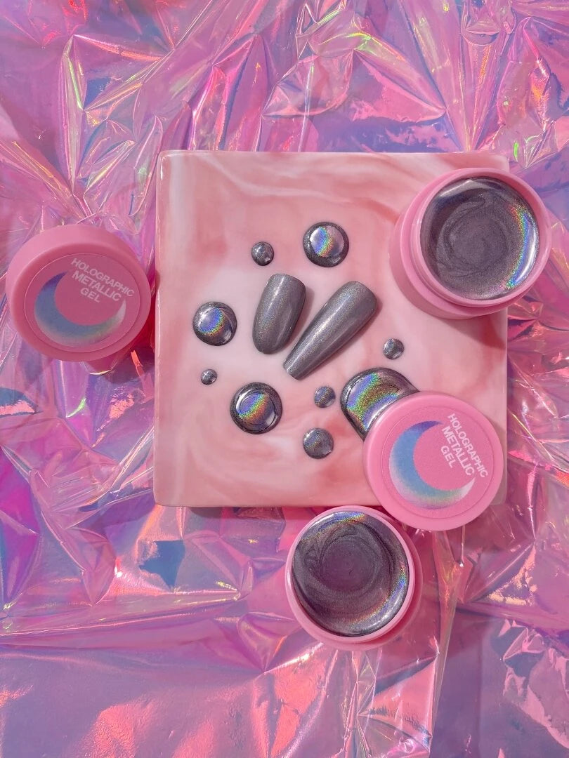METALLIC HOLOGRAPHIC GEL are metallic gel paints for designs. They are quite liquid, making them perfect for creating compositions.