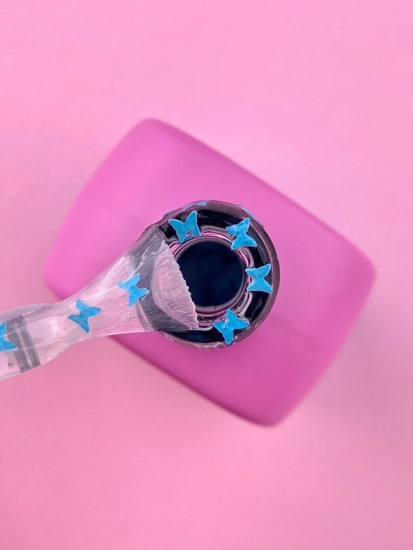 Top Butterfly Blue is a no-wipe top coat with decorative elements that complements any nail color beautifully. It adds a delicate and unique touch to your manicure.