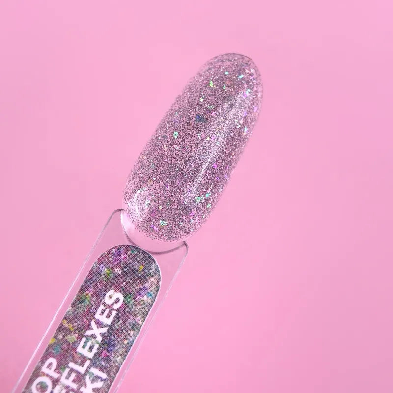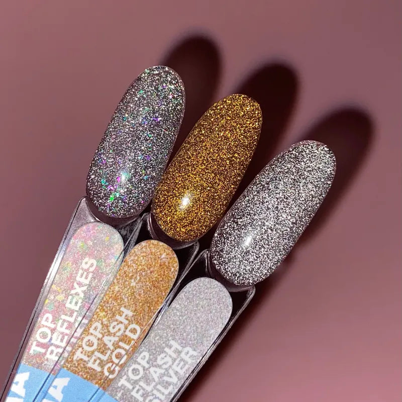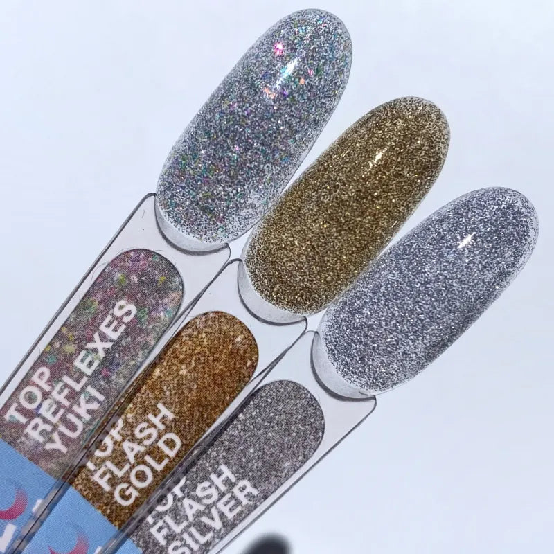 TOP Reflexes Yuki is a reflective no-wipe top coat with silver-toned decorative elements that pairs beautifully with any nail color. It adds a touch of intrigue and uniqueness to your client’s manicure.